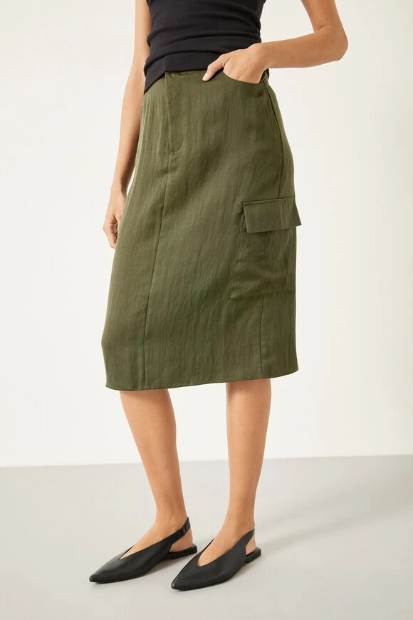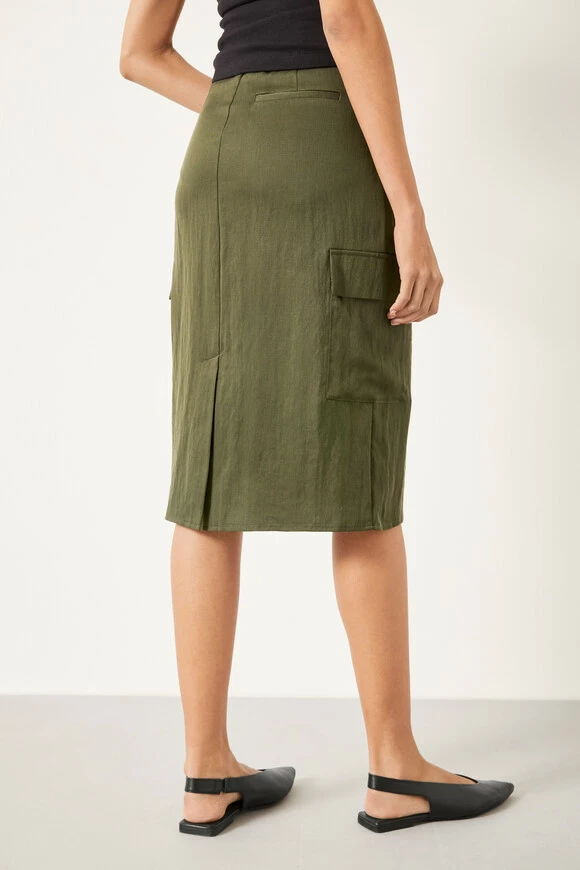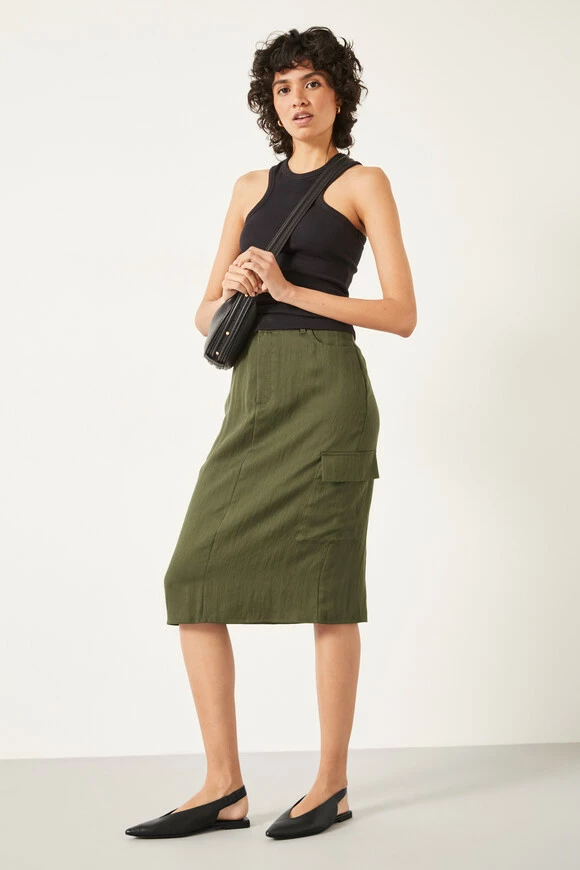We all know that several style staples from the 90s have made a major comeback recently. So we’ve adapted the classic cargo trousers into this cool, lightweight skirt. Cut to a column-style silhouette that’s trimmed with the signature utility details, it finishes at an on-trend knee-length hemline.