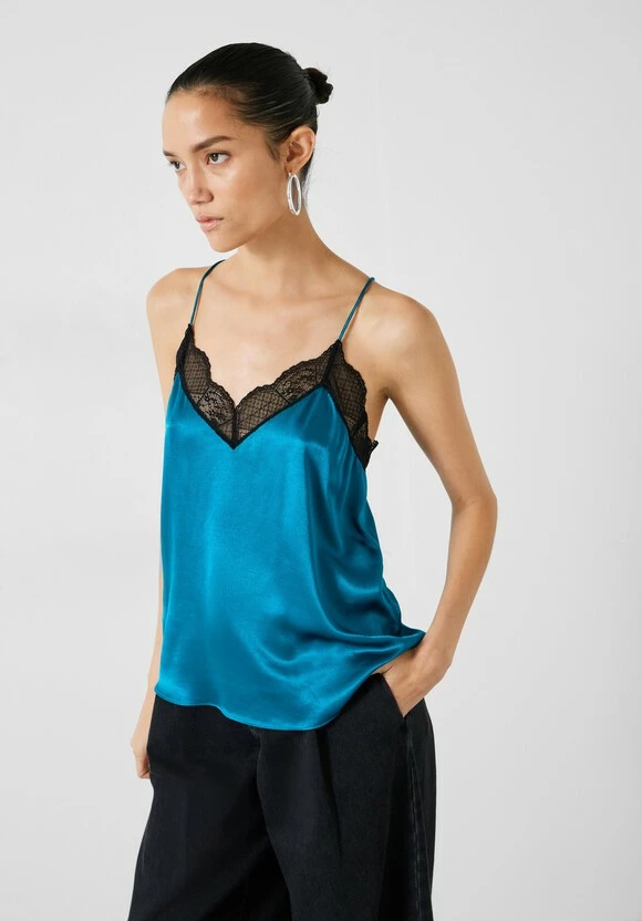 All things lace-trimmed and slinky are perfect for evening, just like our Estella cami. Borrowing its slim-fitting, strappy silhouette from underwear drawers, it’s cut from satin that’s trimmed with eyelash lace. It’s a great way to dress up denim – without the effort.