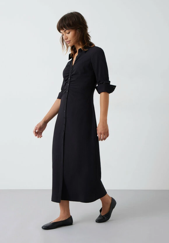 We love how flattering ruched detailing is, and we also love that it taps into the early 2000s revival that’s influencing the fashion world right now. Our Gianna shirt dress is ruched at the front with button fastenings, made from a stretchy textured fabric to add interest to its classic black tone.