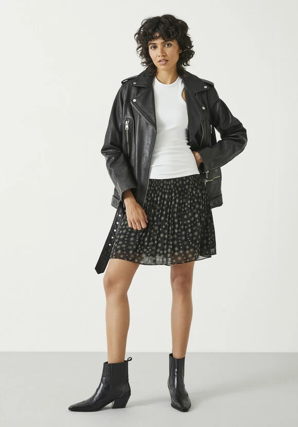 A classic style within our collection, the Nevah skirt returns this season in a new, shimmering star print. Adorned with micro pleats, its silhouette flares out slightly towards the hem to create swishy movement.